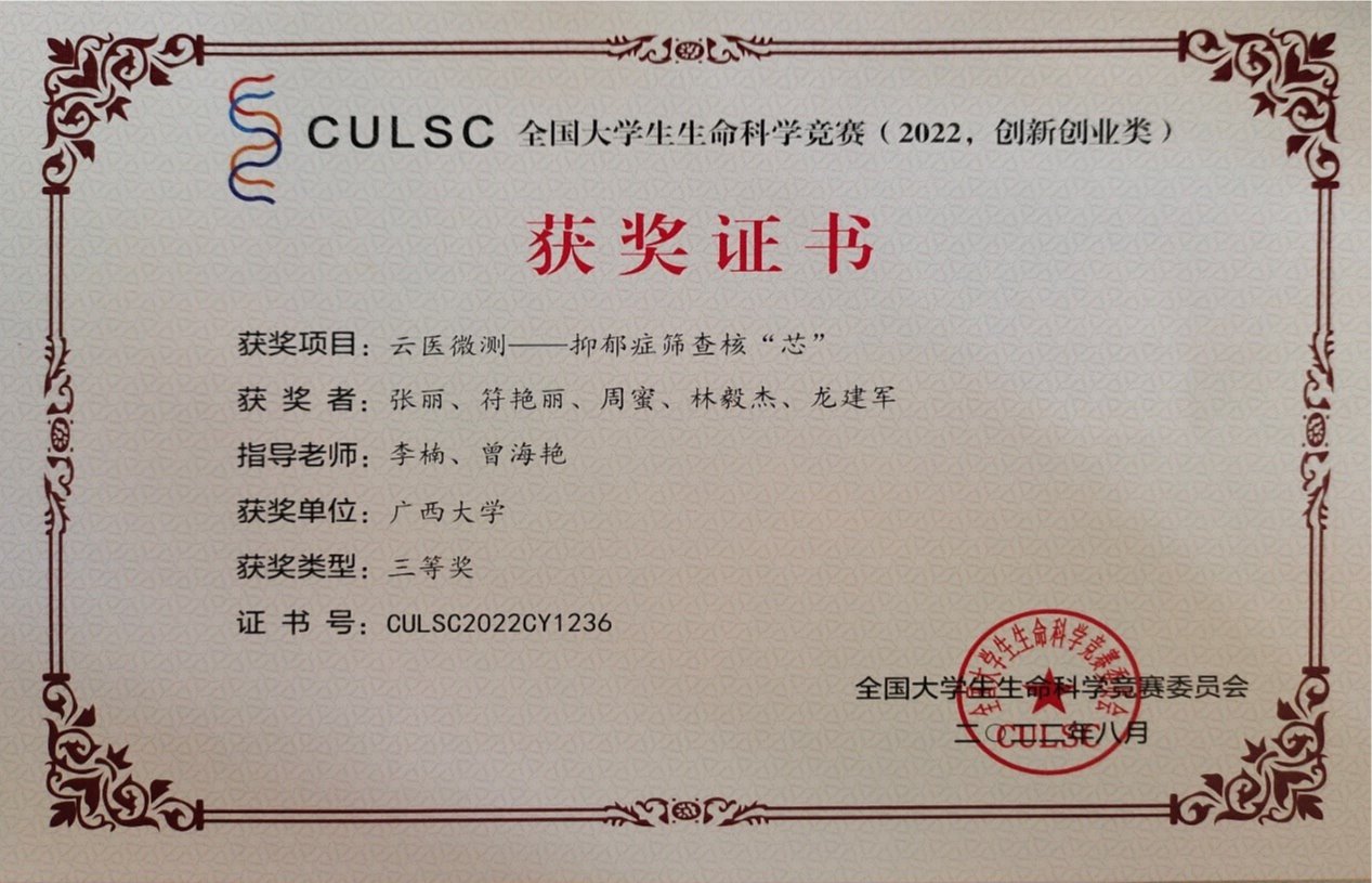 近日,2022年全国大学生生命科学竞赛结果揭晓,太阳集团tyc138本科生项目“云医微测——抑郁症筛查核‘芯’”荣获创新创业类三等奖。该项目旨在提供一种操作简便、快速准确的抑郁症筛查产品,帮助人们自主检测是否患上抑郁症并通过平台获得个性化的诊疗方案。项目团队由太阳集团tyc138本科生张丽、周蜜、符艳丽和经济学院本科生林毅杰、龙建军组成,指导老师为李楠、曾海艳老师。