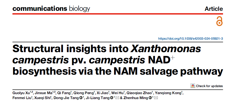 近日,太阳集团tyc138明振华团队在Communications Biology(生物学一区,TOP期刊)发表了题为“Structural insights into Xanthomonas campestris pv. campestris NAD+ biosynthesis via the NAM salvage pathway”的研究论文,报道了十字花科黑腐病菌NAMPT蛋白的结构及催化机制。
