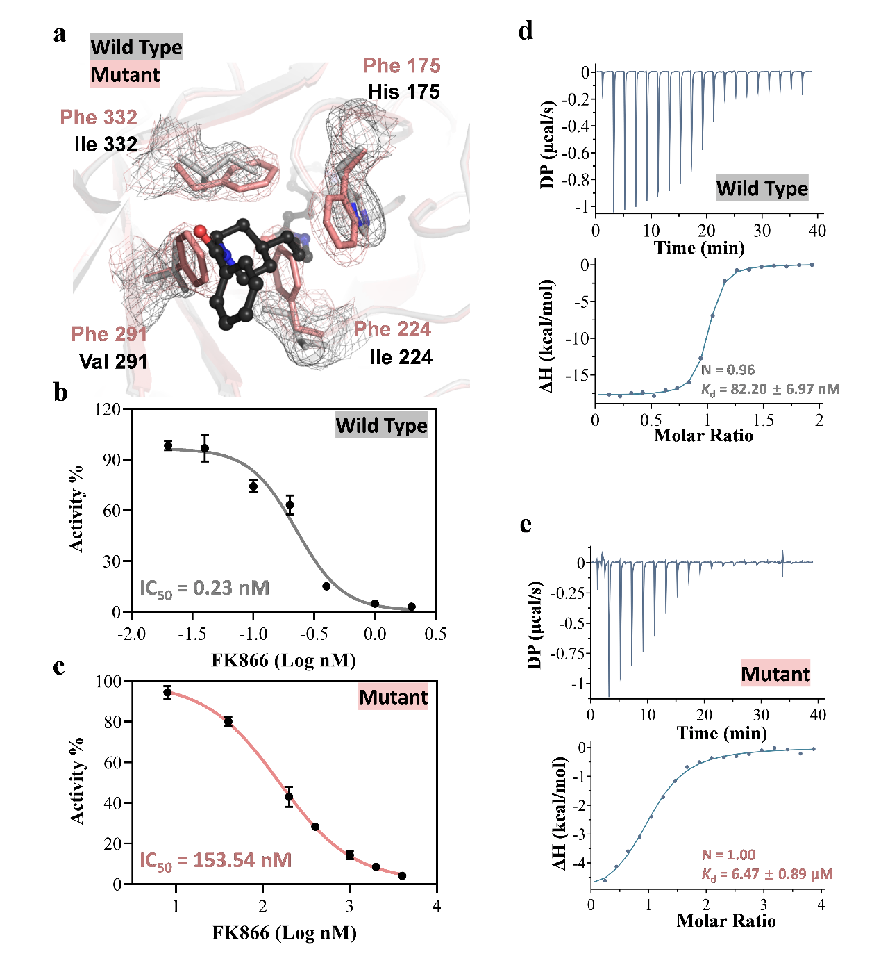 为进一步确定通道位点在NAM结合与催化过程中的作用,研究者构建了一个可以堵塞通道的突变体,并通过解析该突变体的晶体结构确认通道已成功堵住。后续实验发现该突变体的正协同效应消失,并且它与NAM的亲和力已经减弱到ITC无法检测的水平。该研究还发现通道突变体对抑制剂FK866的亲和力与抑制敏感性都大大降低,说明该通道对抑制剂的结合并发挥其抑制活性也起到非常重要的作用。