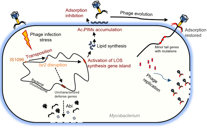 该研究发现噬菌体感染耻垢分枝杆菌后,IS1096转座子可以高频易位并插入lsr2基因,并激活由11个基因组成的LOS代谢基因岛(MSMEG_4727– 4737)的表达,从而赋予宿主对分枝杆菌噬菌体的广泛抗性。此外,该研究还成功进化分离出一种噬菌体,这种噬菌体的尾丝基因发生了突变,可以重新摆脱分枝杆菌的防御,产生成熟子代噬菌体。