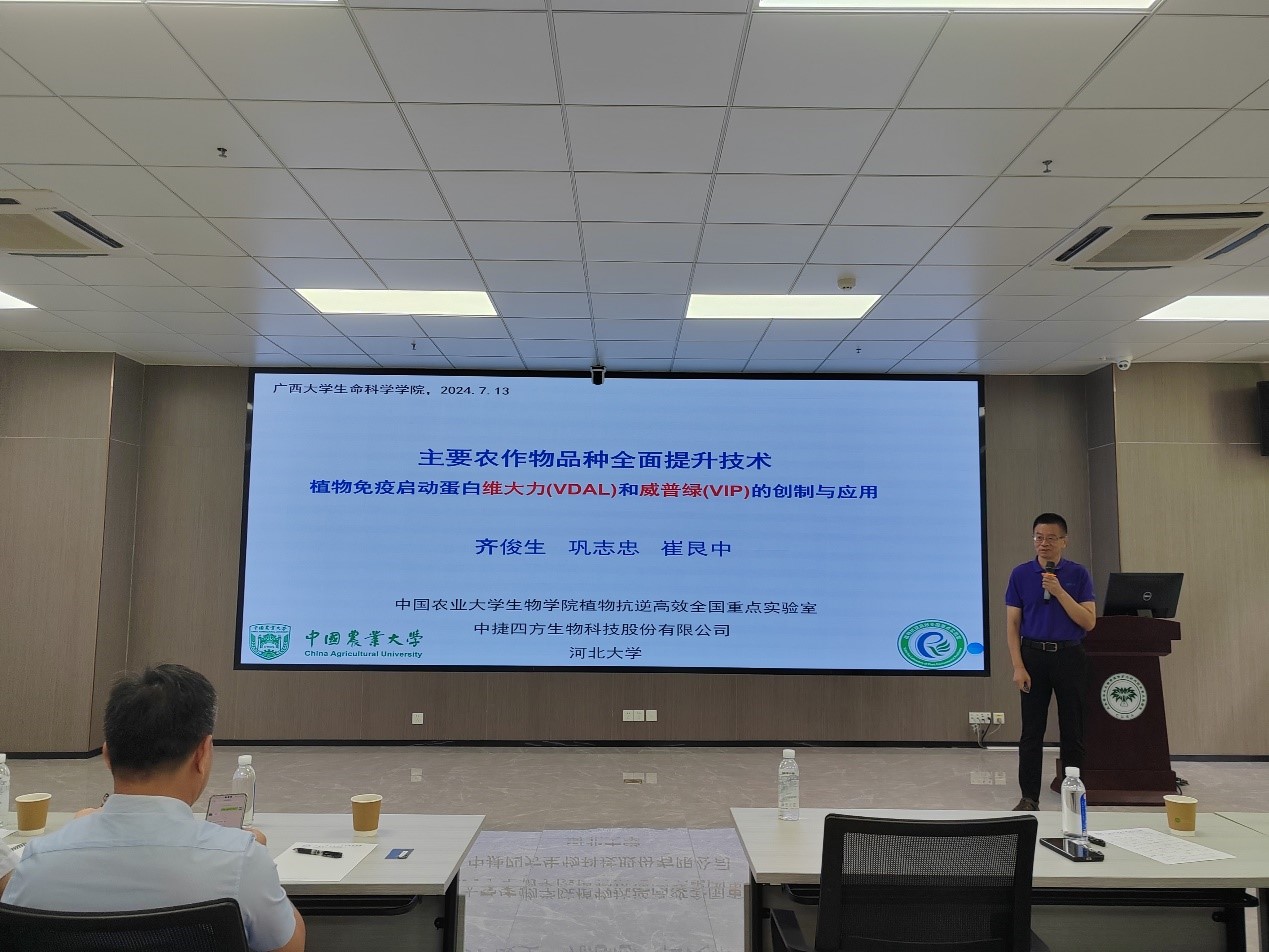 巩志忠教授作了题为“主要农作物品种齐全面提升技术——植物免疫启动蛋白维大力和威普绿的研发与生产应用”的学术报告。从棉花大丽轮枝菌中分离得到维大力VDAL蛋白以及从棉花中得到与VDAL互作的威普绿VIP蛋白。这两类蛋白可以与所有农药、肥料等混合使用。通过低浓度处理作物种子或喷施叶片等,对抵抗低温、抗旱、抗病等有突出效果,可稳定地提升作物产量和瓜果等品质,确保丰年增产、灾年稳产。在现有的管理基础上有望让目前所有主要粮食品种升级换代(增产5%以上)。