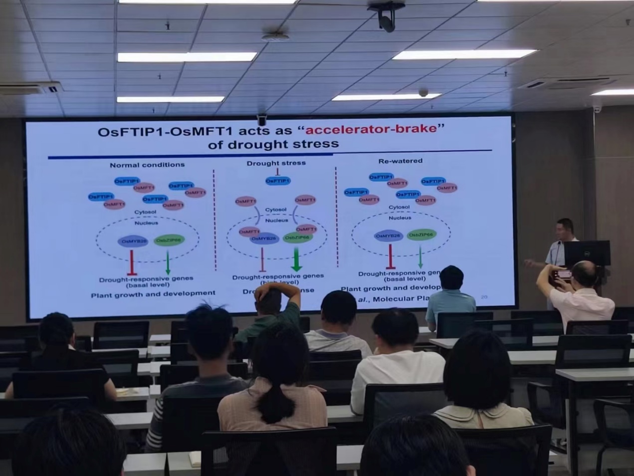 宋士勇教授作了题为“FTIPs-mediated Protein Trafficking in Rice Development and Stress Tolerance”的学术报告。该研究阐释了OsFTIP1-OsMFT1-OsMYB26/OsbZIP66分子模块参与水稻干旱胁迫应答的分子机理,揭示了水稻通过精细调控关键蛋白的核质穿梭进而影响正负调节因子调节下游基因表达的能力,以实现高效合理的干旱应答的新机制,为后续水稻抗旱遗传改良提供了新思路。