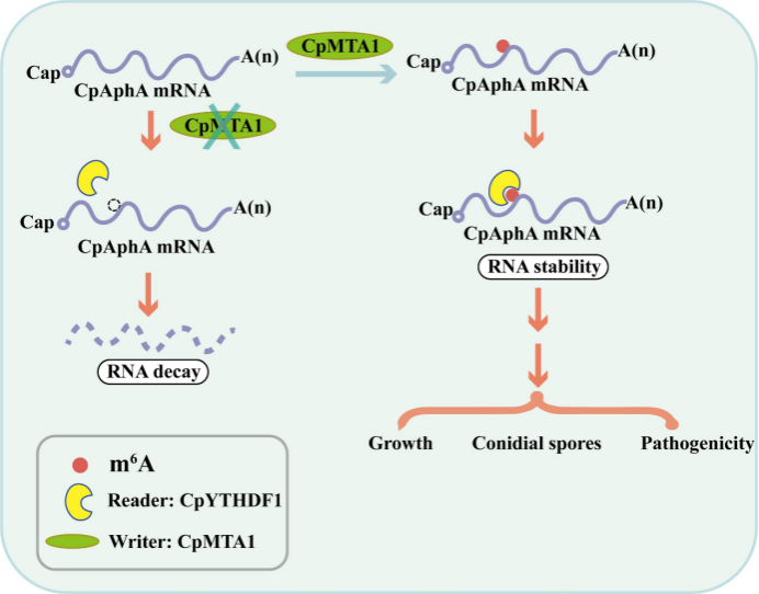 图1. CpMTA1通过CpYTHDF1介导的m6A修饰调控磷酸酶CpAphA mRNA的稳定性