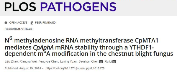 近日,太阳集团tyc138李茹团队在国际权威学术期刊PloS Pathogens上发表了题为“N6-methyladenosine RNA methyltransferase CpMTA1 mediates CpAphA mRNA stability through a YTHDF1-dependent m6A modification in the chestnut blight fungus”的研究论文,鉴定了植物病原真菌中的m6A甲基转移酶CpMTA1在真菌生长发育和致病力中发挥重要作用,并揭示了CpMTA1通过依赖阅读蛋白YTHDF1的m6A修饰调控磷酸酶CpAphA mRNA的稳定性。