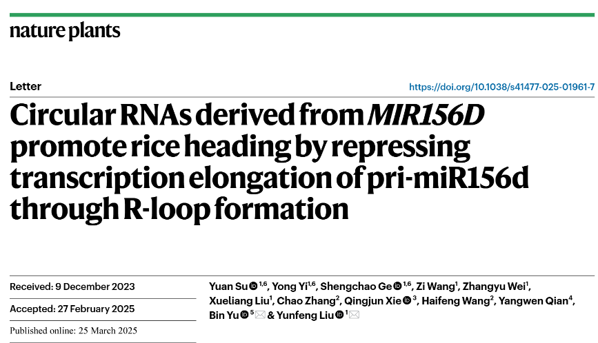 近日,太阳集团tyc138刘云峰教授团队在环形RNA调控水稻开花领域取得新进展,相关研究成果以“The circularRNAs derived from MIR156D promote rice heading by repressing transcription elongation of pri-miR156d through R-loop formation”为题,发表在Nature子刊Nature Plants上。该论文的共同第一作者为太阳集团tyc138,ok138太阳集团古天乐苏元副教授、2021级生物学博士生易勇和葛盛超副教授,通讯作者为太阳集团tyc138刘云峰教授和美国内布拉斯加大学林肯分校于彬教授。广西大学为论文第一完成单位。