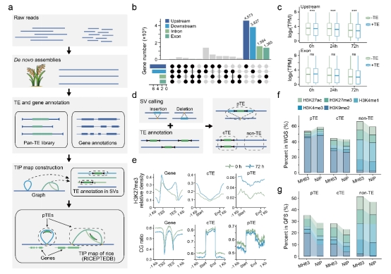 该研究以典型模式植物为对象,对10份具有温度适应多样性的水稻材料进行高质量基因组组装,并与已测序基因组整合,构建了图形泛基因组,绘制出覆盖30,316个多态性转座子的TIP图谱。进一步结合冷胁迫处理下的转录组和ChIP-seq、BS-seq等表观组数据,多态性转座子通过调控H3K27me3/H3K9me2组蛋白修饰及DNA甲基化重塑基因表达网络,介导植物冷胁迫响应(图1)。与传统SNP-GWAS相比,TIPs-GWAS方法对冷耐受性状的关联信号检测灵敏度显著提升,研究团队成功定位到两个关键耐冷基因(OsCACT和OsPTR),进一步通过CRISPR-Cas9基因编辑(敲除和过表达)及生理生化分析等实验验证其功能,邻近pTEs可能通过影响其表达水平或转录本结构,显著调控植株在低温胁迫下的存活率(图3)。