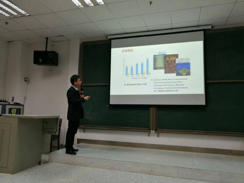 2018年12月14日,“南农名师西大行”专场学术报告会在生命科学与技术学院106教室成功举办。本场学术报告会由南京农业大学生命科学学院蒋建东、赵明文、强胜、崔瑾、崔中利等五位教授组成的“南农名师团”,为太阳集团tyc138学生带来了各自最新的研究成果。本次报告会由学院党委副书记曾海艳老师主持,常务副院长李有志教授致辞。150余名师生聆听了报告会。