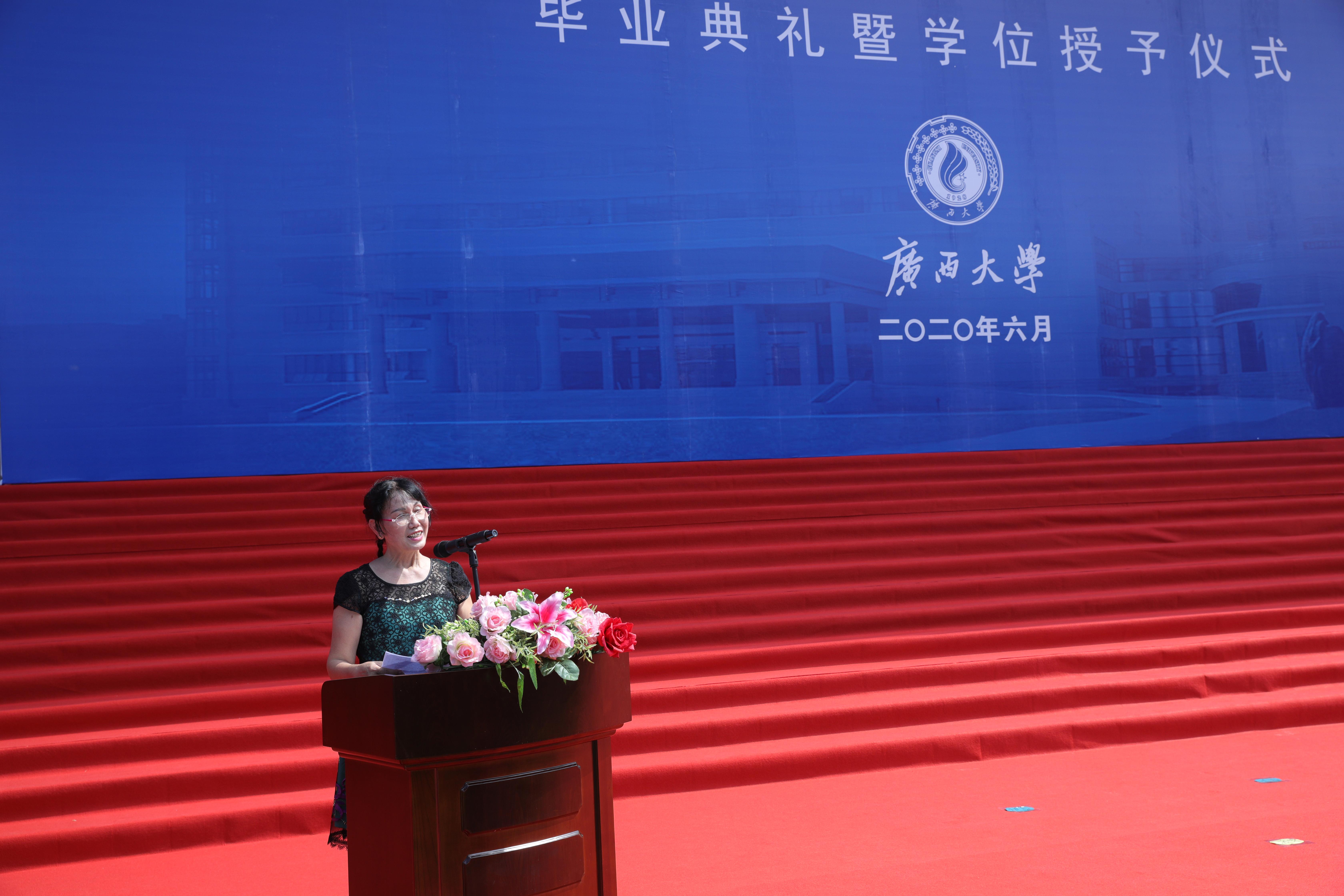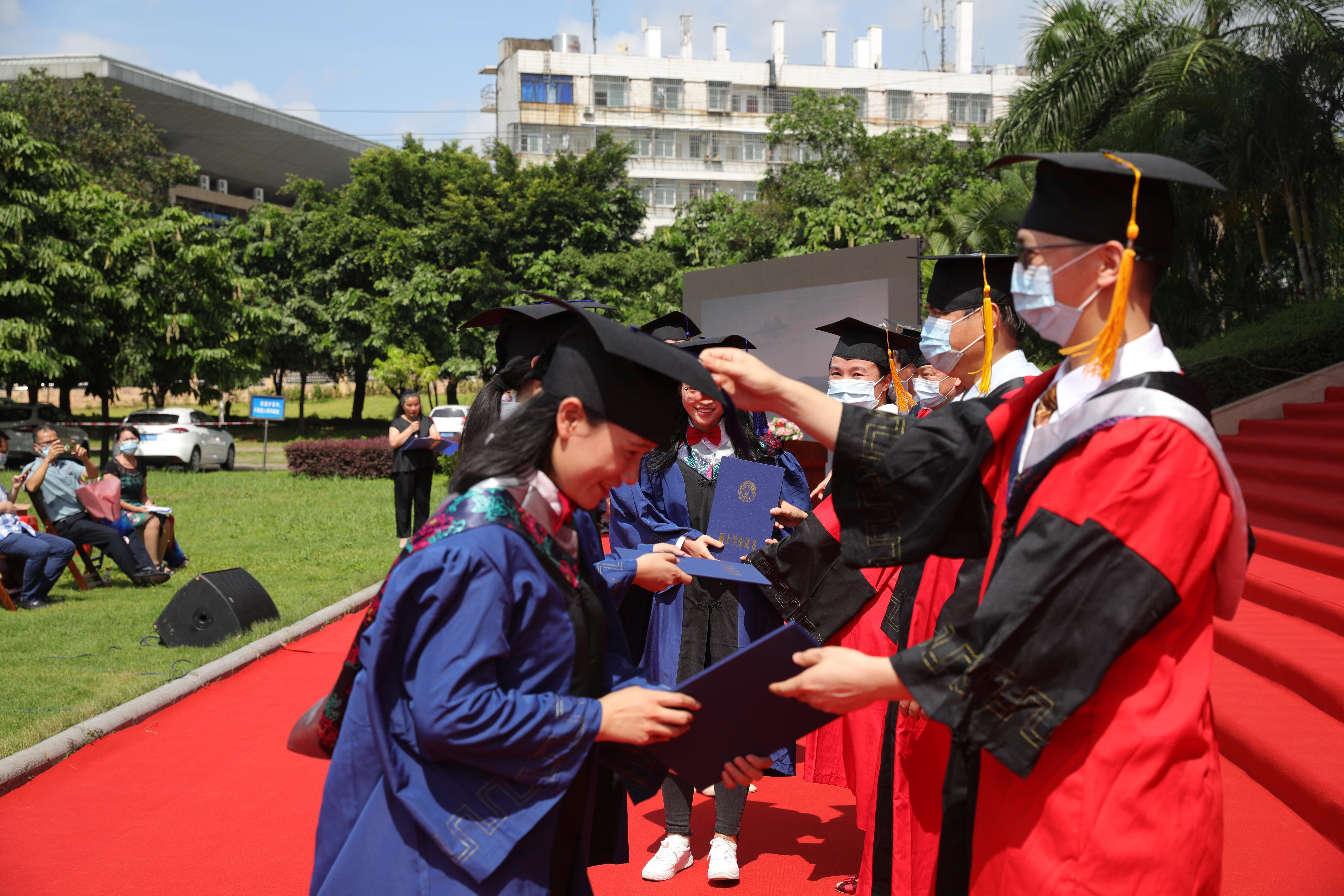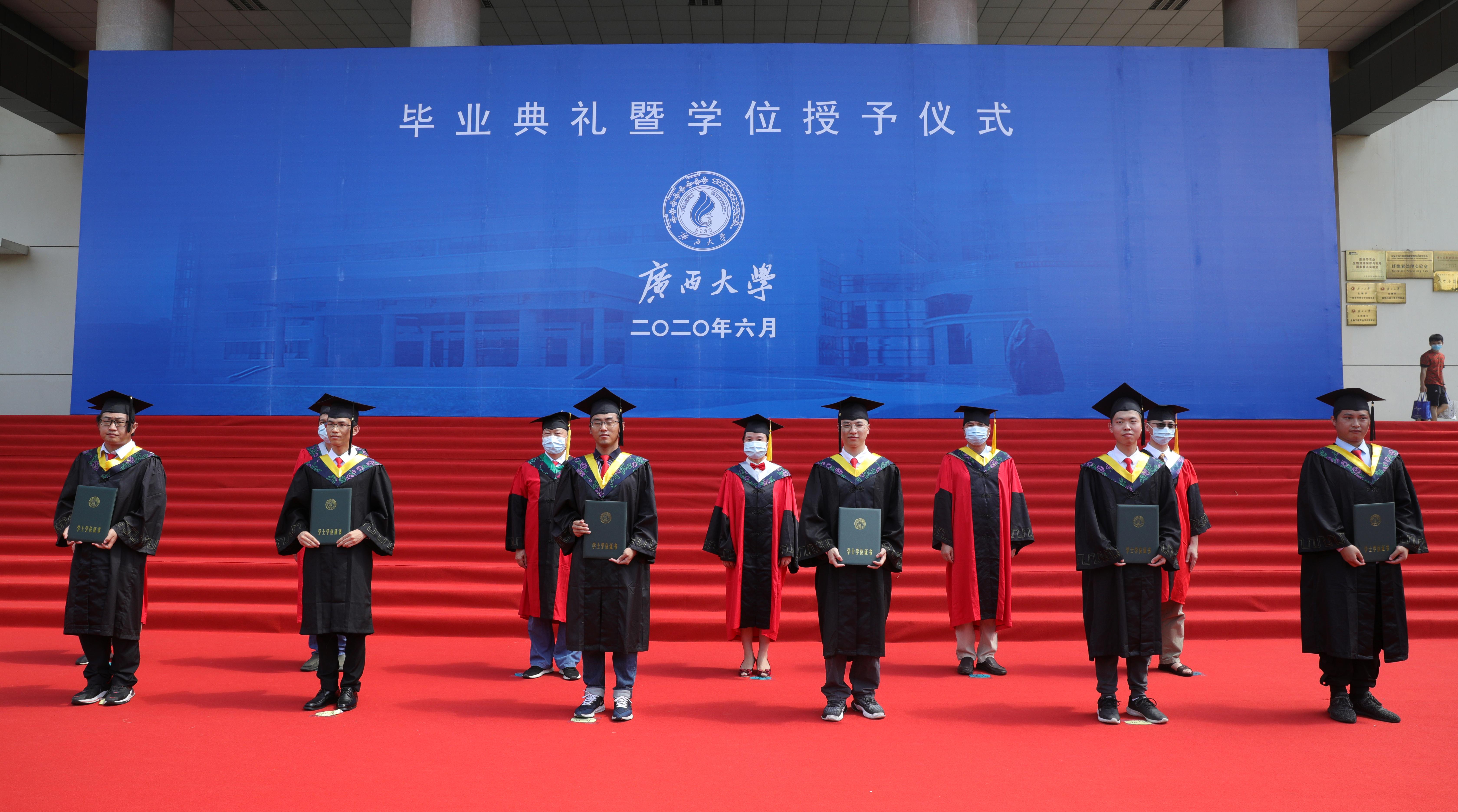 6月22日,广西大学2020届毕业典礼暨学位授予仪式如约举行,在汇学堂设典礼主会场的同时,还在各学院设立了143个分会场。生命科学与技术学院分会场在学院大楼前的草坪举行,是太阳集团tyc138首次举办户外毕业典礼暨学位授予仪式。学院党委副书记曾海艳主持典礼,全院103名毕业本科生、65名毕业硕士研究生和部分导师、家长参加了本次典礼。