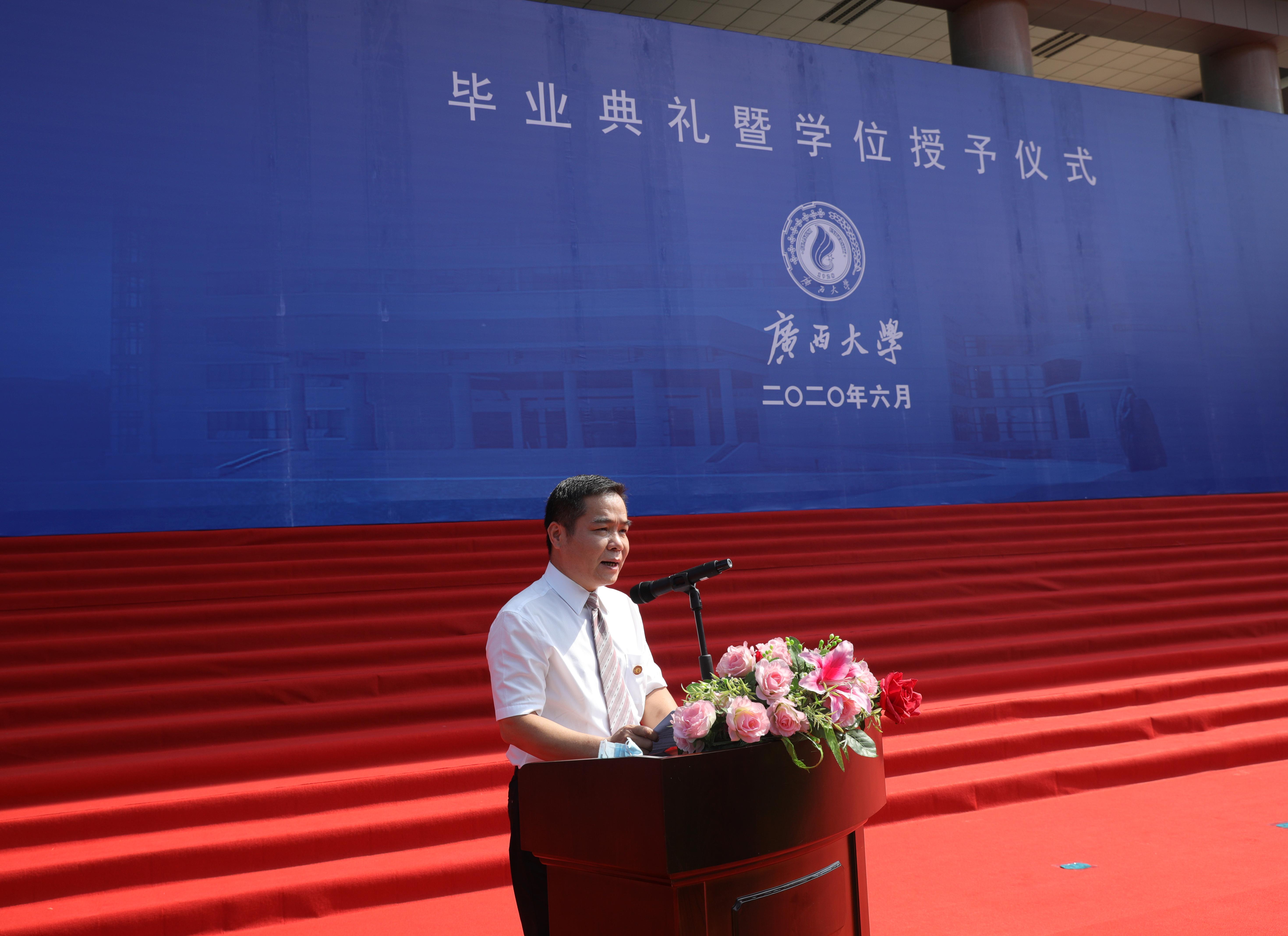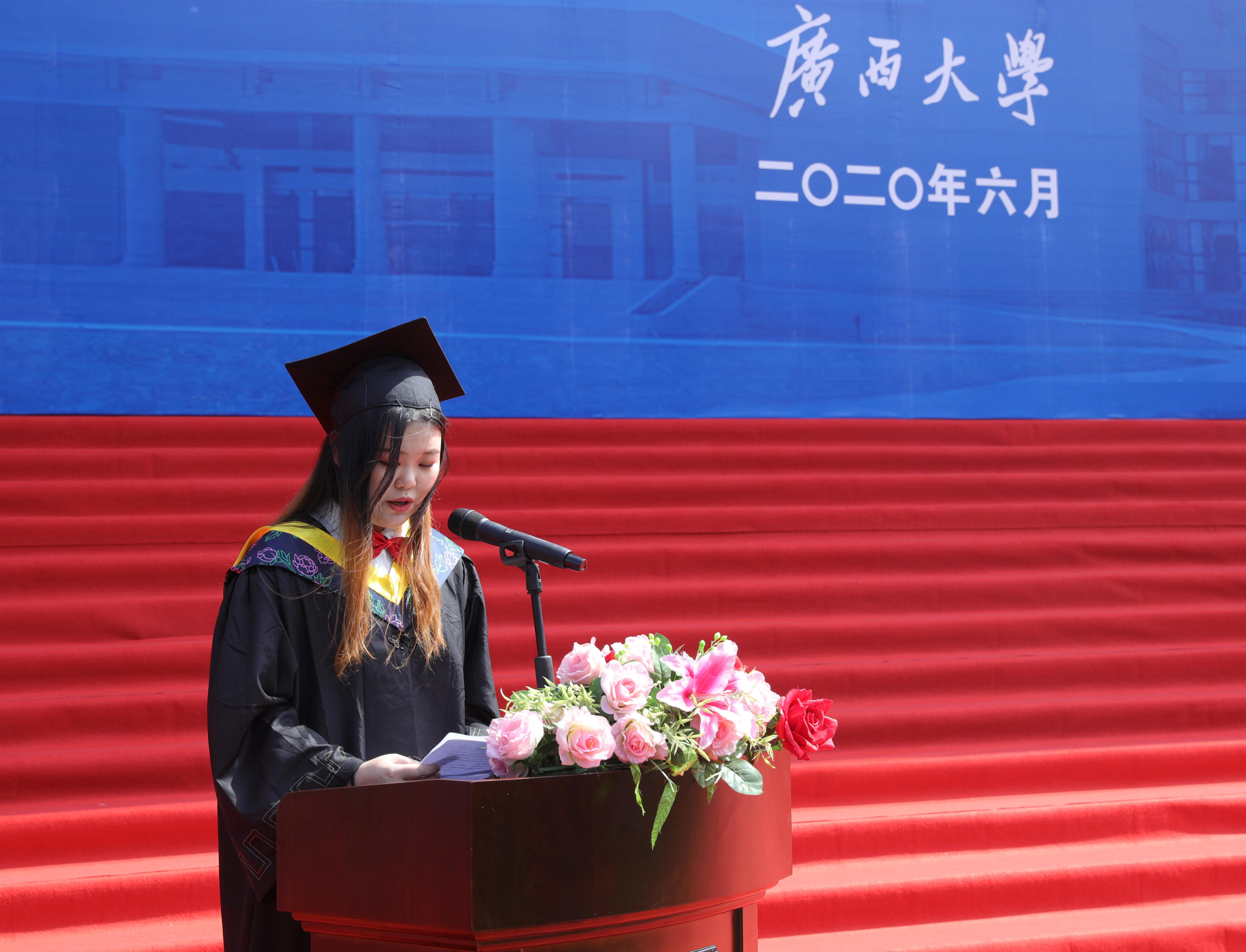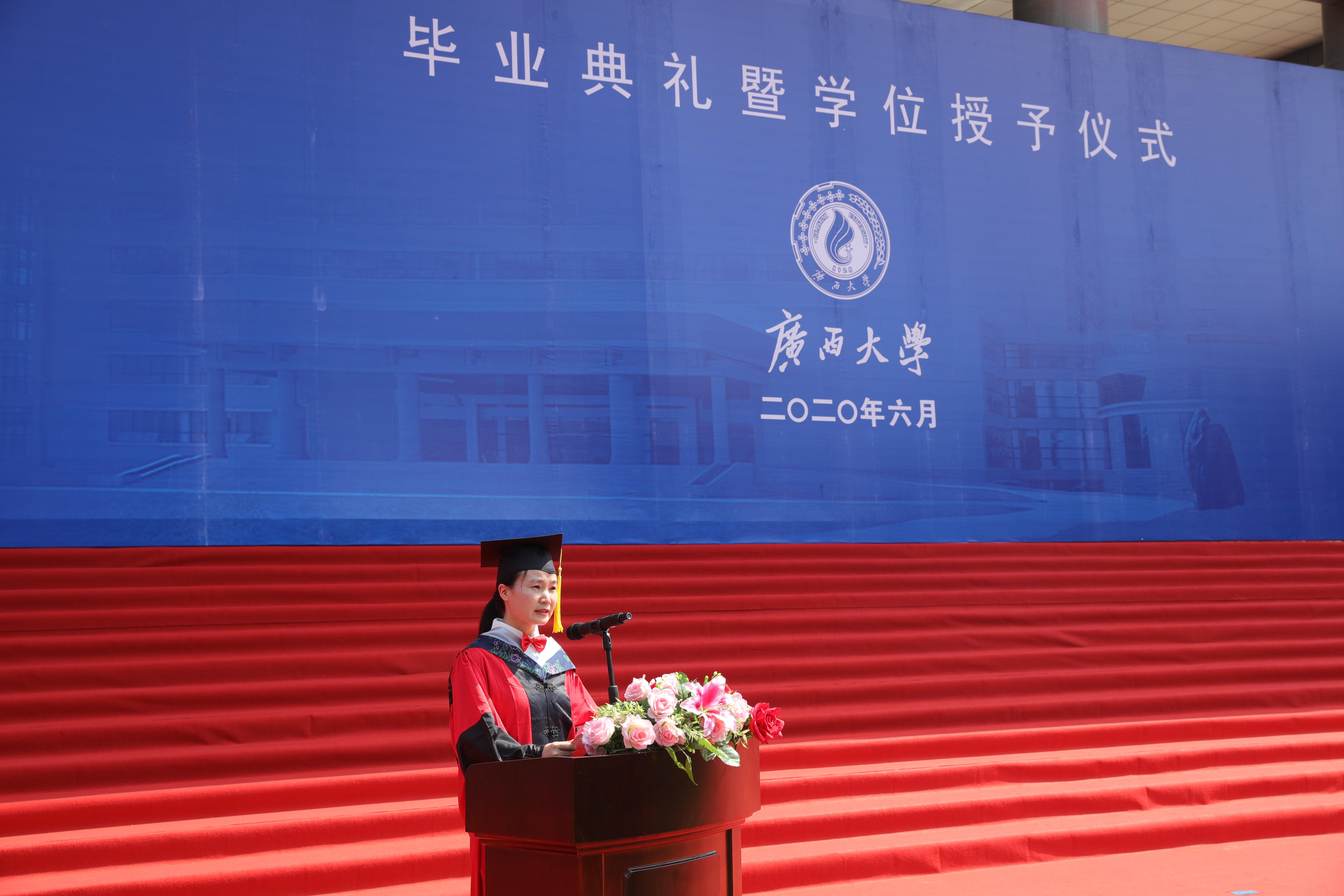 这场充满着清新气息的毕业典礼暨学位授予仪式,为严格疫情防控之下的毕业季增添了一份浓浓的惜别情绪,注定让太阳集团tyc138学子们对校园生活留下独特的记忆,终生难忘。上午9时,典礼在庄严的国歌中拉开帷幕,院党委书记莫柏林对毕业生们表示祝贺,勉励同学们以抗疫一线的优秀校友为榜样,具有家国担当,勤学向善,砥砺前行,获得生活和事业上的成功;教师代表申佩弘教授感谢同学们在最美好的青春年华与老师们并肩作战度过了难忘时光,告诉毕业生,不论同学们将来遇到怎么样的难险阻或是灿烂辉煌,母校和老师永远是大家的支持与鼓励;家长代表陆美莲女士和毕业生代表李欣颖回顾了同学们求学中的点点滴滴,对学校、学院的培养和老师们的教导表达了感激之情,祝愿母校和学院发展越来越好,祝愿老师们工作顺利、阖家安康。最后,学院学位评定分委员会委员组成的导师团为毕业生拨穗、授予毕业证书和学位证书,仪式在老师、同学们共同唱响的《广西大学校歌》歌声中落下帷幕。