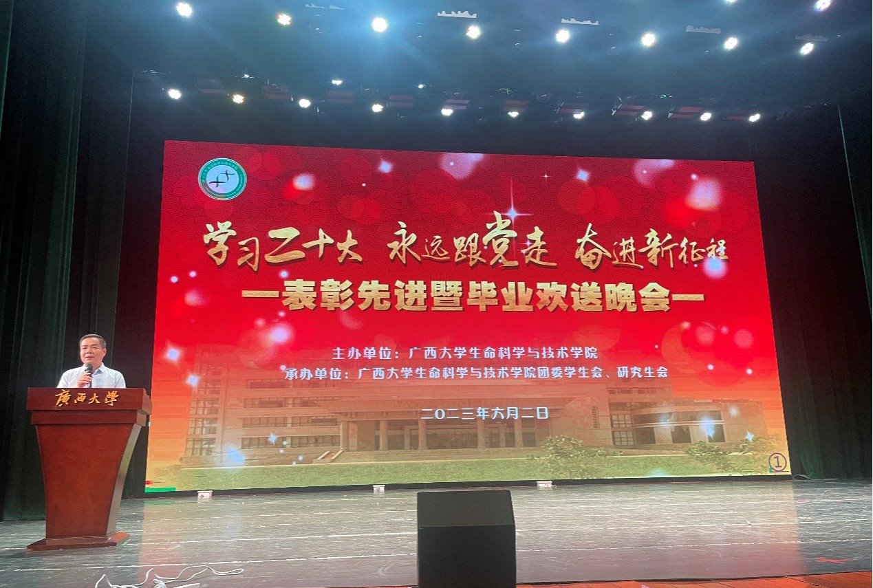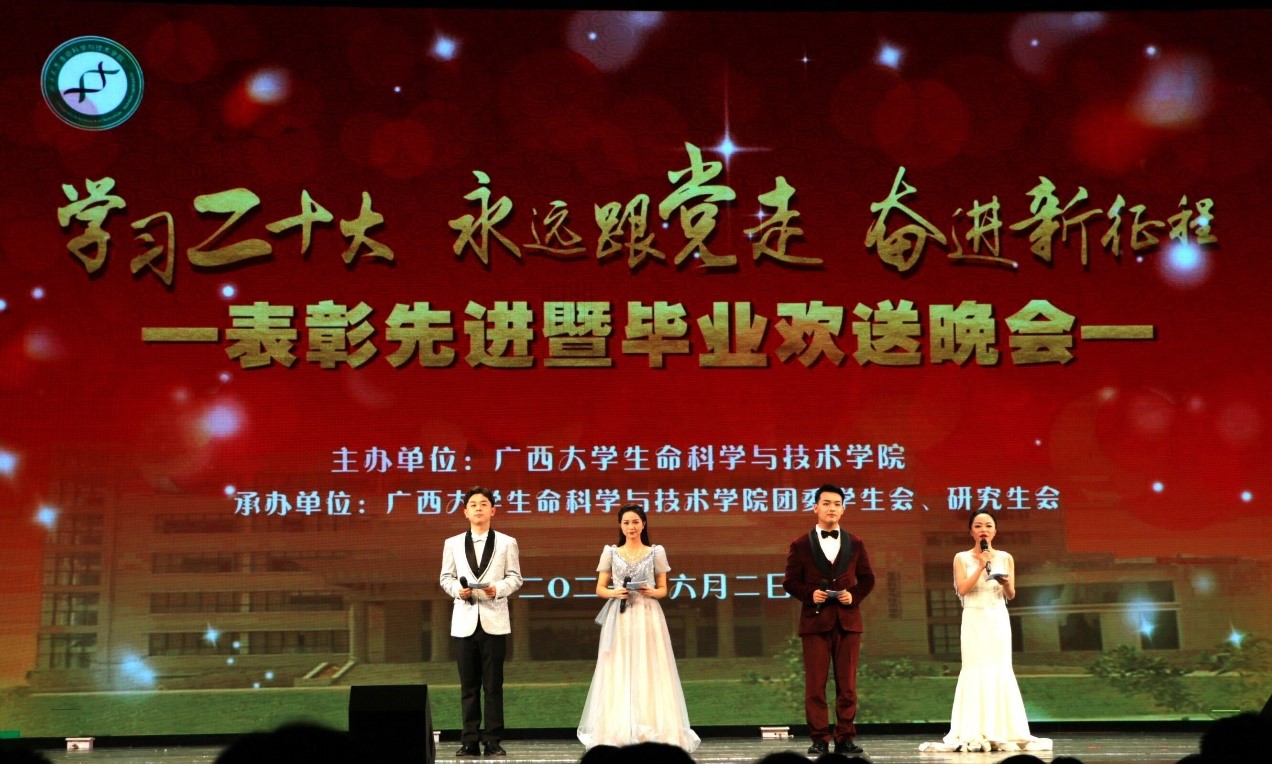 6月2日晚,在全国上下深入开展学习贯彻习近平新时代中国特色社会主义思想主题教育之际,太阳集团tyc138以“学习党的二十大、永远跟党走、奋进新征程”为主题的2023年表彰先进暨毕业欢送晚会在大礼堂隆重举行。校学生工作部(处)部(处)长黄必春、院党委书记莫柏林、院长何正国、常务副院长李有志、校学生工作部(处)副部(处)长王利军、副院长李伟辉、院长助理卢洁、院各系(中心)主任、毕业生班主任、辅导员及全院学生出席本次晚会。