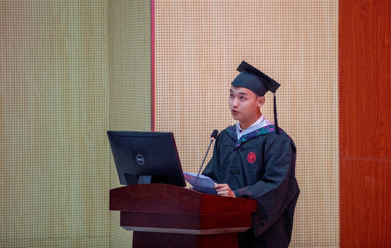 学位授予仪式结束后,毕业生代表杨欣昊同学回顾大学四年生活的点点滴滴,对学校、学院的培养和老师们的教导表达了衷心的感激之情,希望毕业生们牢记校训,砥砺前行。