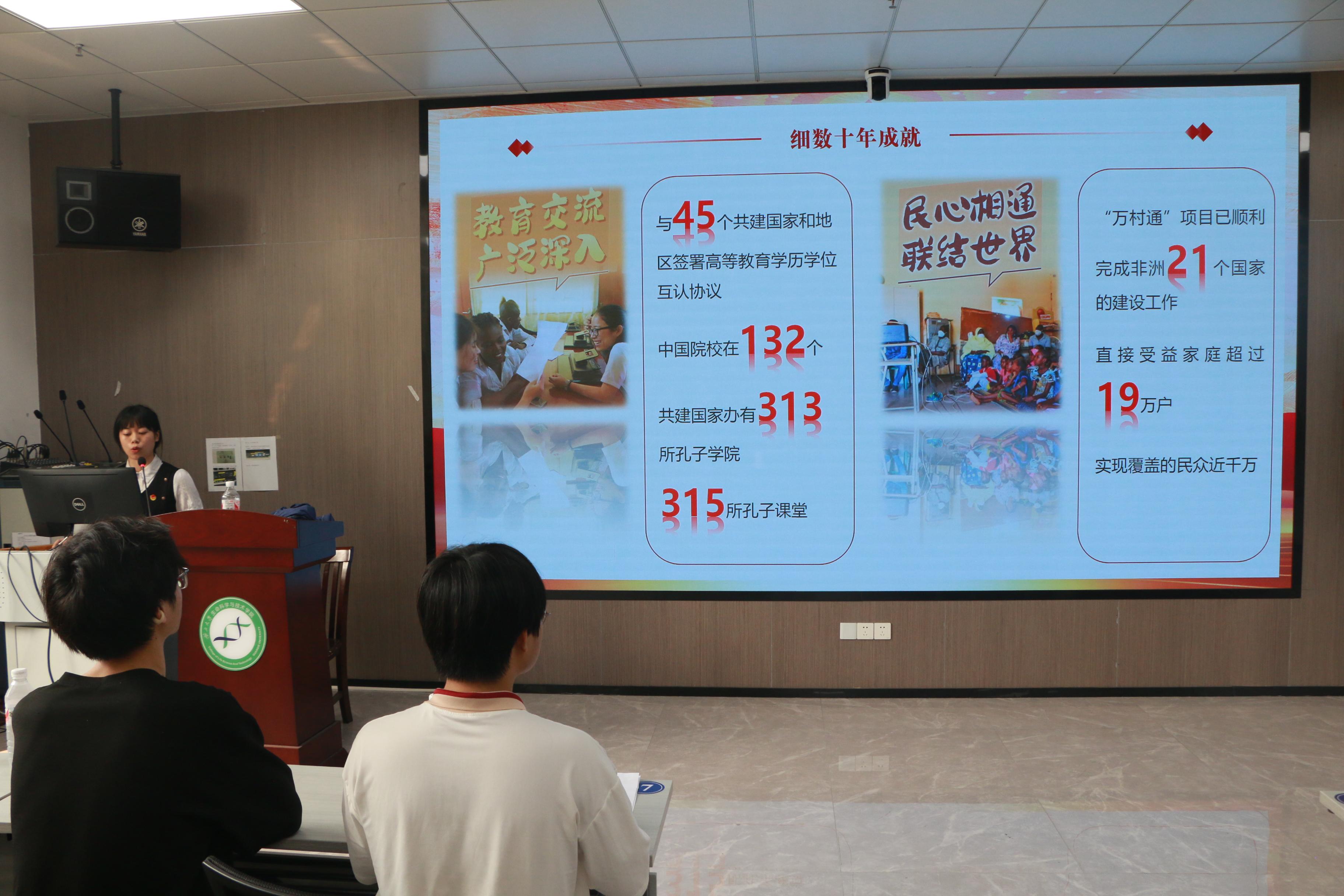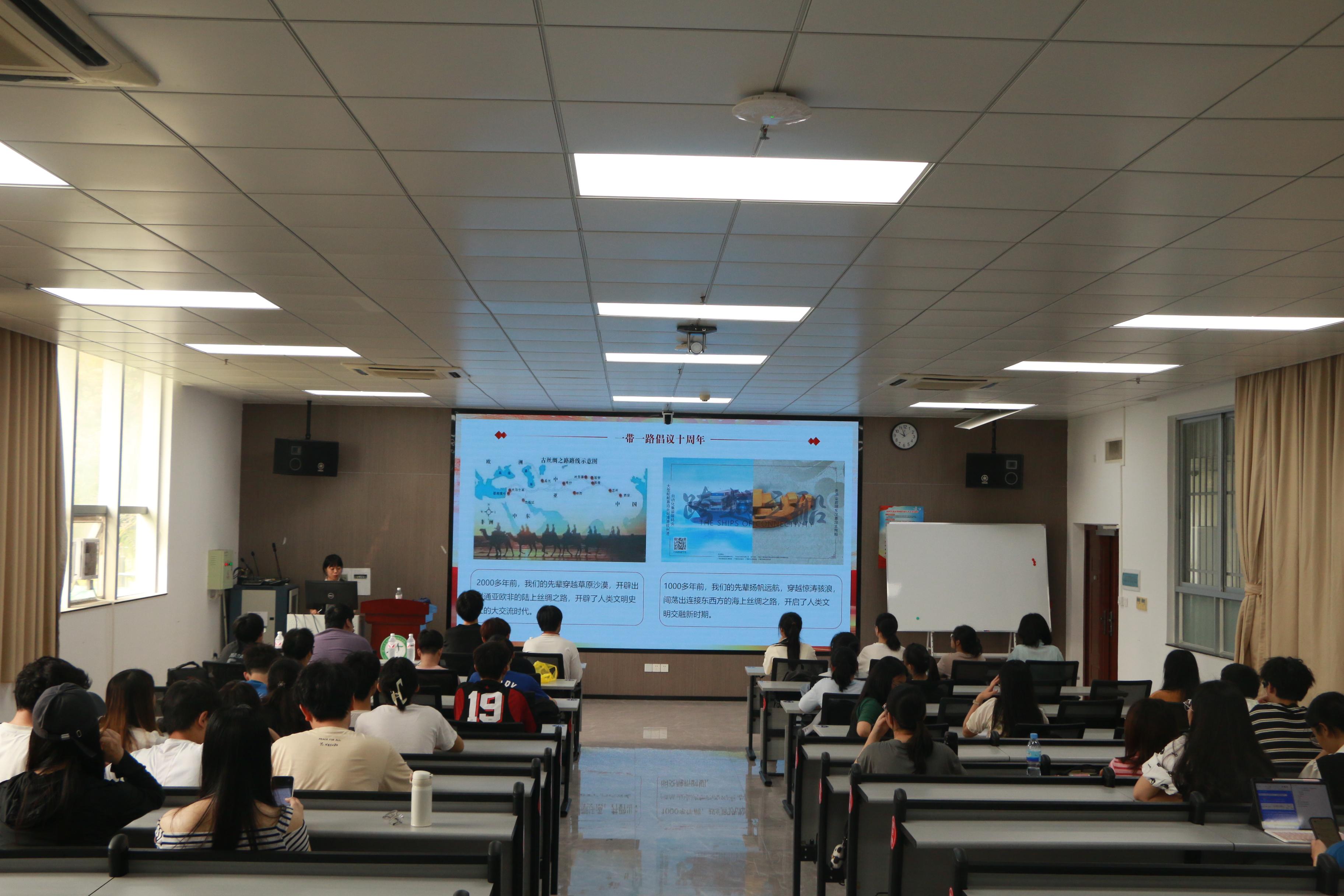 蓝渝泓给同学们讲述了“一带一路”的含义和丝路精神的内涵。2013年9月和10月,习近平总书记在出访中亚和东南亚国家期间先后提出共建“丝绸之路经济带”和“21世纪海上丝绸之路”的重大倡议,简称“一带一路”。“一带一路”倡议是习近平总书记着眼当今世界发展全局,为各国搭建互联互通的有效平台,促进文明进步和人类社会发展,推动构建开放型世界经济提出的中国方案。“一带一路”倡议根植历史,更面向未来。古丝绸之路绵亘万里,延续千年,积淀了以团结互信、平等互利、包容互鉴、合作共赢为核心的丝绸之路精神。丝路精神,根植于历史,面向未来;源于中国,机会和成果属于世界。