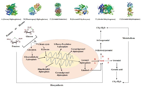 为了进一步研究GXDK6发酵产生香气的分子机理,以橙花醇作为代表的新型芳香代谢物,与GXDK6的全基因组数据进行了进一步比较和分析,并进一步阐明了其代谢途径(图1)。橙花醇(Nerol, C10H18O)作为有价值的香料,广泛应用于食品、化妆品和医药产业中。目前化学合成是大规模生产橙花醇的唯一策略,但是化学合成的缺点极大地限制了橙花醇的生产和应用,然而限制环保的生物合成法生产橙花醇的主要技术瓶颈是,缺乏相应的天然产生香气的微生物。橙花醇的来源首先是将糖酵解或柠檬酸循环的上游来源1-脱氧-d-木酮糖5-磷酸香叶基二磷酸或芳樟醇橙花醇转化为最终的香叶酸或8-氧香叶醛。在此过程中,参与橙花醇合成的蛋白质是香叶基二磷酸酶,单三苯基二磷酸酶和香叶醇异构酶。涉及橙花醇代谢转化的蛋白质是香叶醇8-羟化酶,醇脱氢酶和香叶醇脱氢酶。相关报道在大肠杆菌代谢工程菌中发酵葡萄糖合成橙花醇,积累量为0.053±0.015 mg /L。橙花醇是由tNDPS1基因催化二磷酸异戊烯基(IPP)和磷酸二甲基烯丙酯(DMAPP)形成了神经磷酸二磷酸酯(NPP),然后将橙花醇合成酶基因GmNES共表达以从NPP合成最终产物橙花醇。然而,以葡萄糖为底物发酵时,GXDK6的橙花醇积累约为2.74 mg/L(p <0.05),高于通过大肠杆菌发酵产生的橙花醇,但橙花醇在天然Meyerozyma guilliermondii的生物合成机理尚未被报道。本研究研究表明具有多重耐受性的生香季也蒙毕赤酵母GXDK6在发酵工业中具有巨大的潜在价值(Microbial Cell Factories. 2021, 20: 4)。
