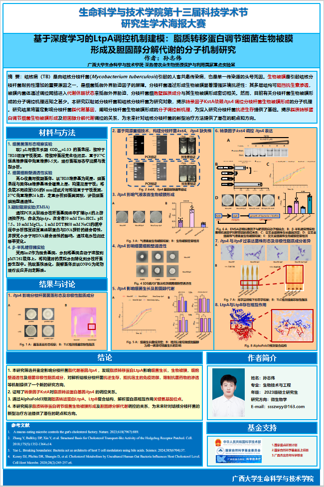 研究生学术海报大赛以“人工智能遇见生命科学”为主题,旨在促进跨学科交流,展现研究生科研创新水平。大赛吸引了众多研究生参与,涌现出了多幅高质量作品。经过最终评审,博士组崔旭杰、苏子惠荣获一等奖,硕士组李康、孙志伟荣获一等奖。本次研究生学术海报设计大赛不仅为同学们提供了一个展示自我、学习交流的平台,也激发了他们的创新思维,促进了人工智能与生命科学的交叉融合。