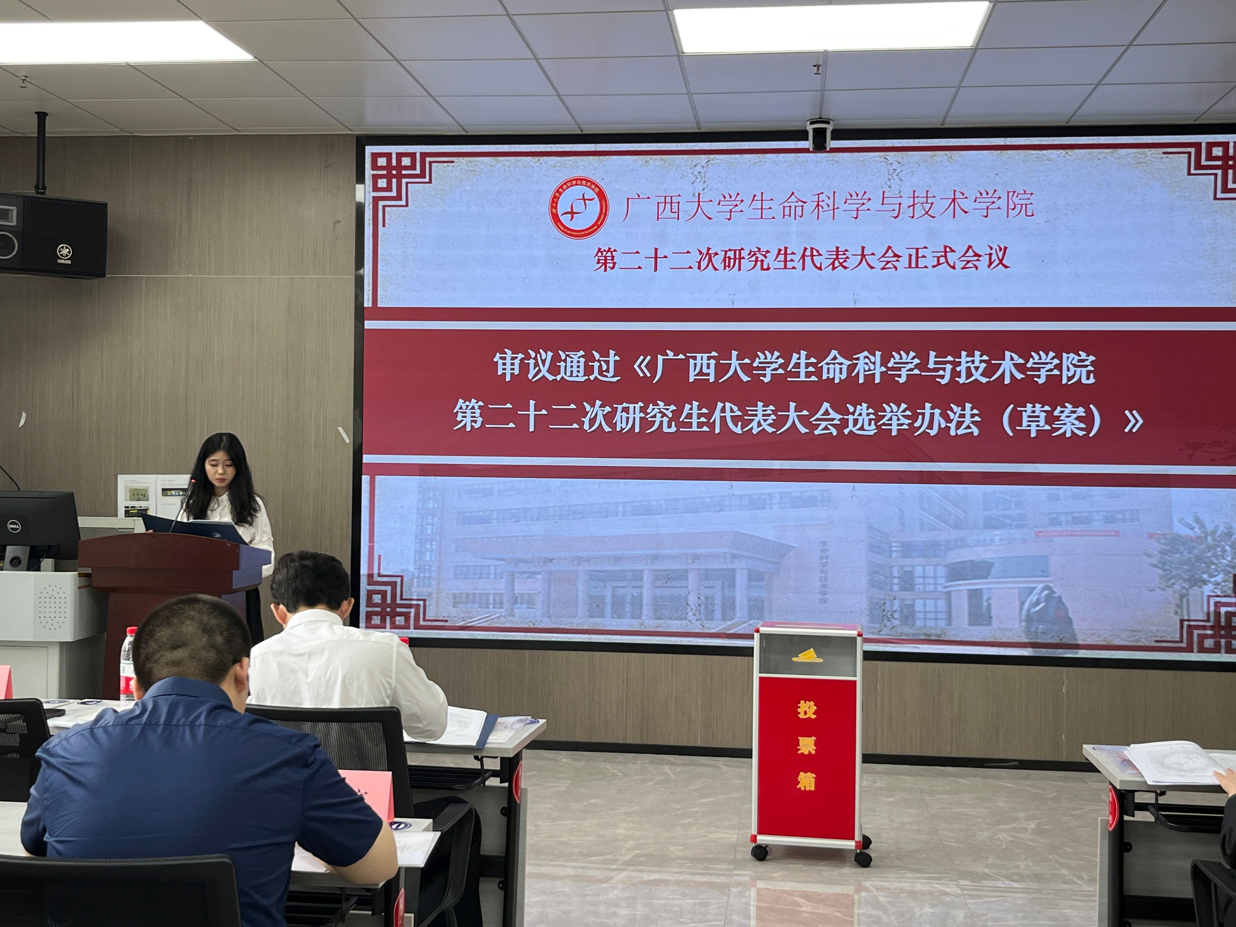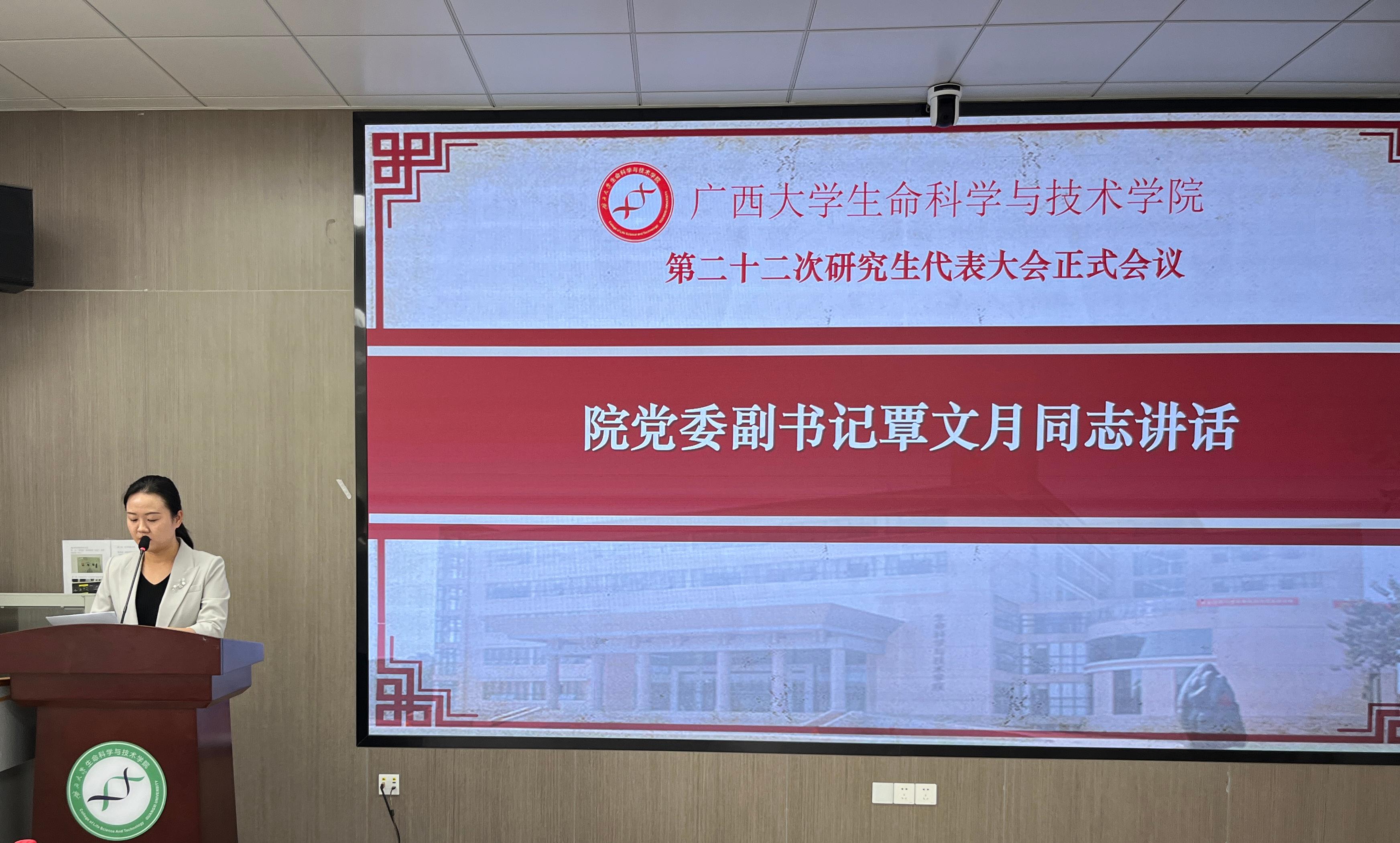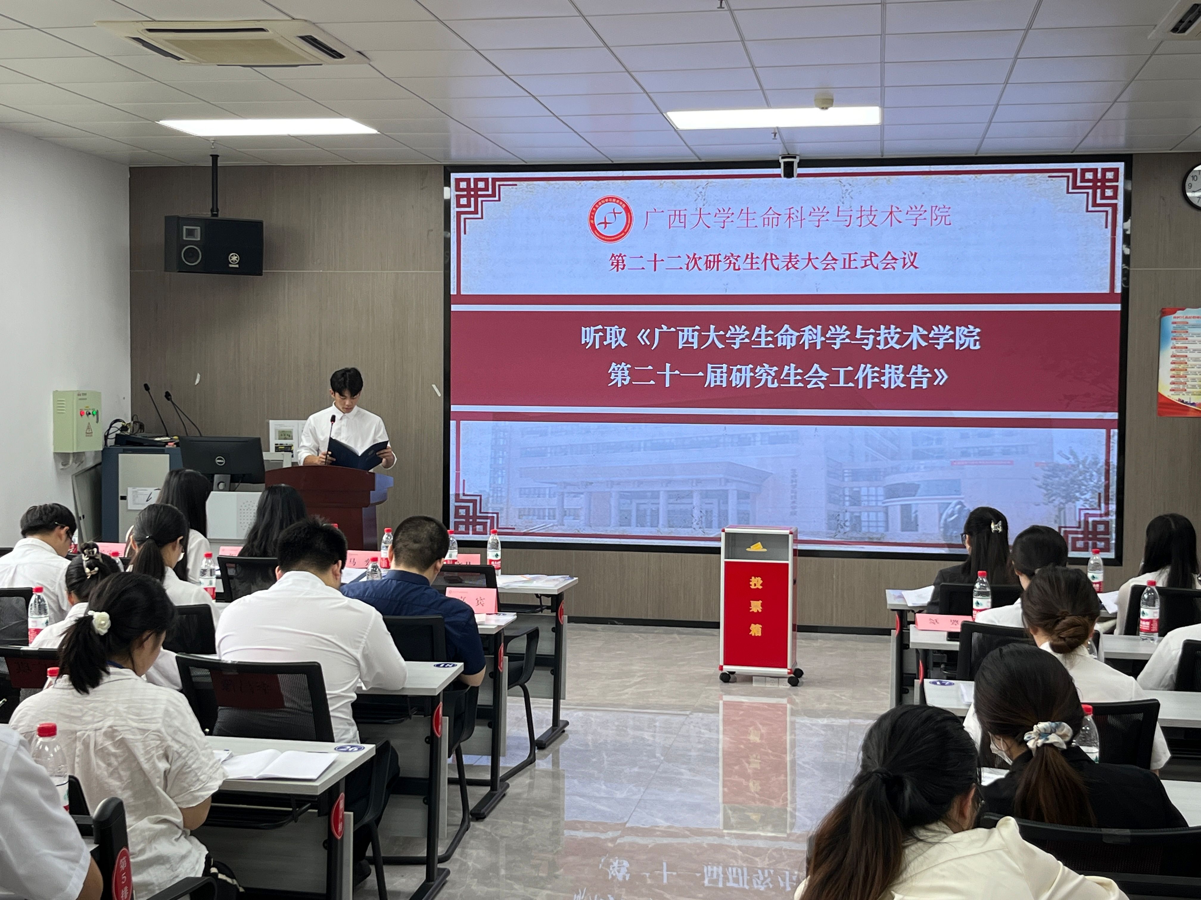10月29日下午,太阳集团tyc138第二十二次研究生代表大会正式会议在学院106室顺利召开。学院党委副书记、纪委书记覃文月,团委书记马奕,学工组辅导员贺超、关家运,广西大学研究生会代表,兄弟学院研究生会代表以及太阳集团tyc138各班级代表出席本次大会。大会由学院第二十一届研究生会执行主席李晓玉主持。