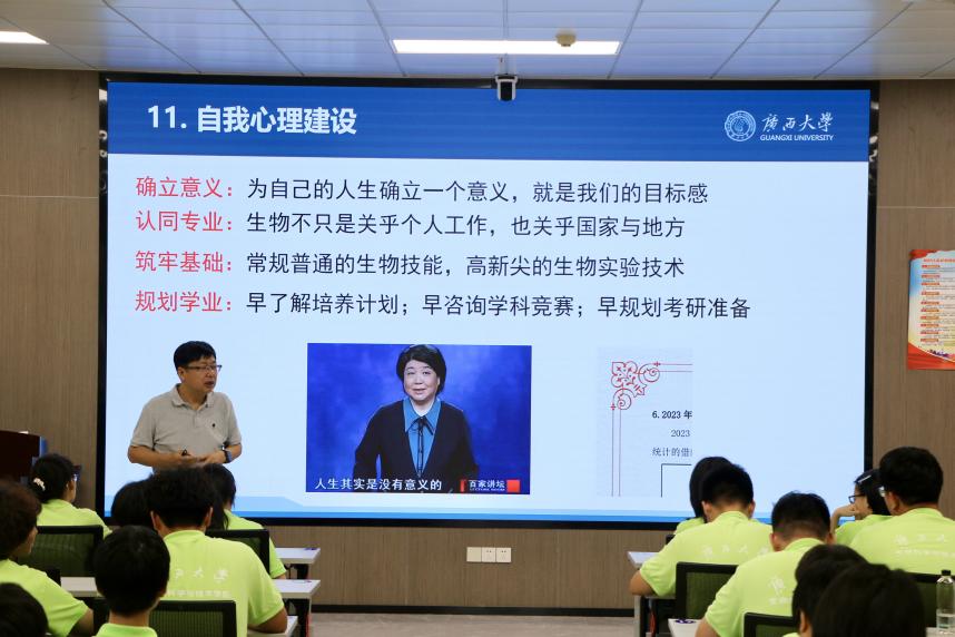 9月17日下午,卢洁副院长围绕学业规划与专业发展,系统梳理并详细解读了2025版培养方案中的六大课程模块,同时就推免、辅修通道、学业预警与帮扶机制等同学们普遍关心的问题进行了详细说明。他还结合广西独特的生物多样性资源禀赋与学院的重点研究方向,生动阐述了生物技术的广阔应用前景与产业发展趋势,帮助同学们建立对专业的整体认知与发展信心。
